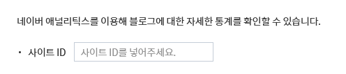 누르면 메뉴가 하나 뜨고, 그 안에는 딱 1개만 입력하면 됩니다. 바로 사이트ID (네이버에서 발급ID라고 부른 바로 그것!) 그것을 아래 입력칸에다가 복사해서 붙여 넣습니다.