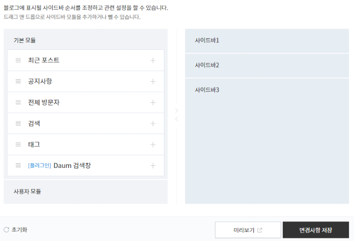 적용 버튼을 누르면 사이드바 설정이 초기화 된다고 경고가 뜹니다. 어차피 지금은 신규 블로그라 들어올 사람도 없으니 그대로 OK를 눌러서 진행합니다.