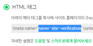 아무나 이거 등록하면 안 되니 사이트 소유확인을 하라고 합니다. HTML 파일 업로드는 티스토리 블로거가 못하는 것이니 아래쪽 HTML 태그를 선택합니다.