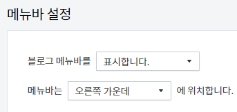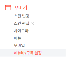 꾸미기 메뉴의 제일 아래를 보면 메뉴바와 구독 설정을 할 수 있습니다. '구독하기' 버튼이 화면에 계속 플로팅 되어 나와서 구독자 늘리기 좋죠. 메뉴바도 마찬가지로 블로그 관리자 메뉴 들어오기 편해서 해 두면 좋습니다.