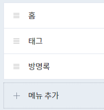 블로그에도 메뉴가 있기는 합니다. 앞서 말한 '꾸미기'에 메뉴가 있습니다. 기본 값은 '홈, 태그, 방명록'입니다. 요즘 방명록 누가 씁니까? 안 쓰죠. 그래서 필요없는 메뉴는 지웁니다.