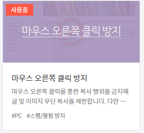 마우스 오른쪽 클릭 방지도 추천합니다. 물론 무력화 시키기 쉽지만, 그래도 쉽게 내 콘텐츠를 복사해 가지 않도록 하는 최소한의 조치입니다.