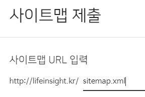 이곳에서 RSS와 사이트맵을 제출합니다. 우선 사이트맵을 누르고 나오는 주소 입력창에 sitemap.xml 이라고 입력하고 확인을 누릅니다.