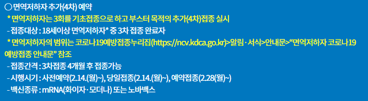 추가로 면역저하자의 경우에도 희망하면 부스터 목적으로 4차 접종을 맞을 수 있습니다. 18세 이상 면역저하자 중 3차까지 맞았는데 필요하다면 맞을 수 있습니다.