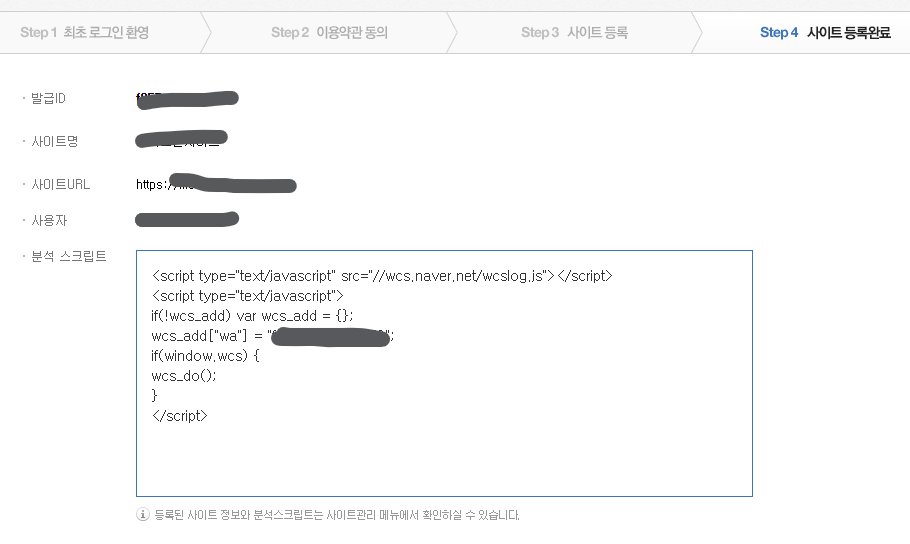 다음버튼을 누르면 등록이 되었다고 하면서 발급ID와 분석 스크립트를 함께 보여줍니다.