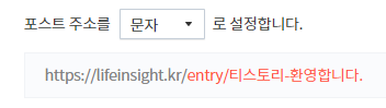향후 서치콘솔 등에 등록하기 전에 미리 블로그 포스트 주소를 숫자로 할지 문자로 할지 정해야 합니다. 문자로 하는 경우가 검색엔진최적화에 도움이 된다는 카더라가 많이 있어서 문자로 많이 하기는 합니다.