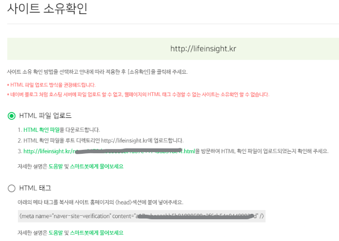 아무나 이거 등록하면 안 되니 사이트 소유확인을 하라고 합니다. HTML 파일 업로드는 티스토리 블로거가 못하는 것이니 아래쪽 HTML 태그를 선택합니다.