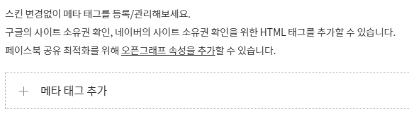 네이버에서는 <head> 섹션에 해당 코드 넣으라고 하지만, 티스토리에서 그럴 필요 없는 기능을 넣어주었습니다. 메타 태그 플러그인 이용하면 너무 쉽게 가능합니다.